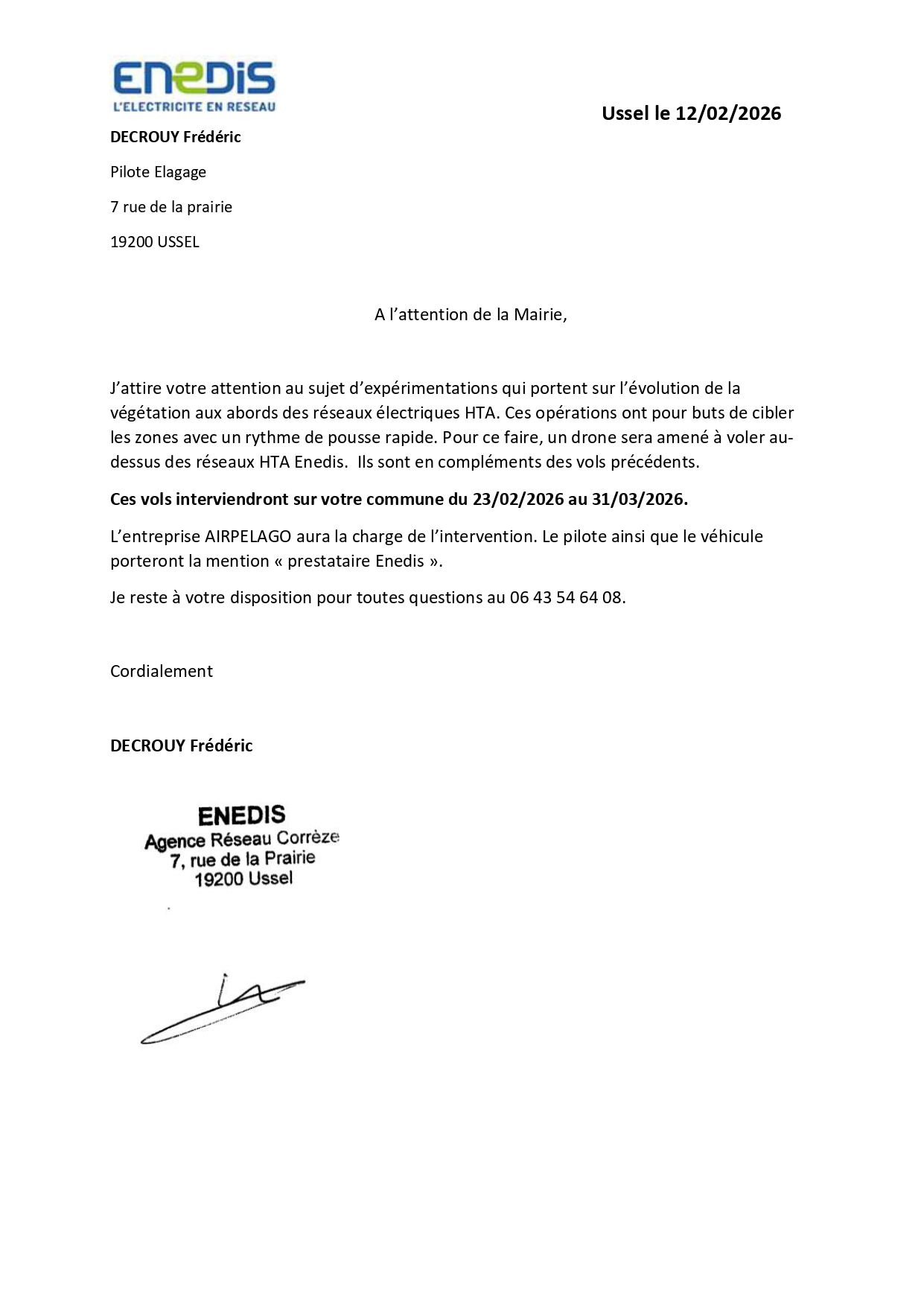 Le pilote et le véhicule de la société AIRPELAGO que vous verrez peut-être circuler seront identifiables facilement car porteurs de la mention : prestataire ENEDIS
