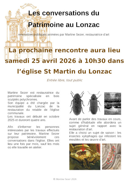 Martine SEZER, restauratrice du patrimoine, spécialisée en bois sculptés polychromes, en charge de la restauration de l’église communale, nous invite à une réunion d’information sur les travaux en cours. Le sujet abordé sera les insectes xylophages qui infestent les meubles et les œuvres d’art.
